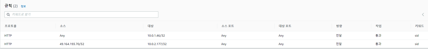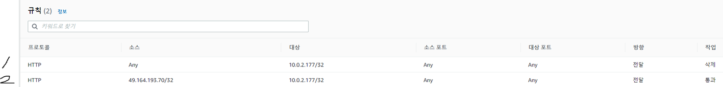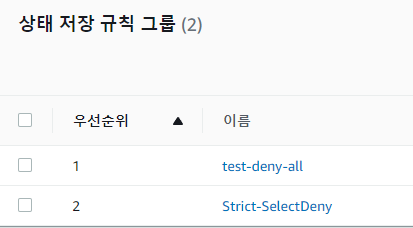 - HTTP ALL DENY 규칙 그룹 생성 후 우선순위를 가장 높게 설정하면, 통과 정책 안먹음.