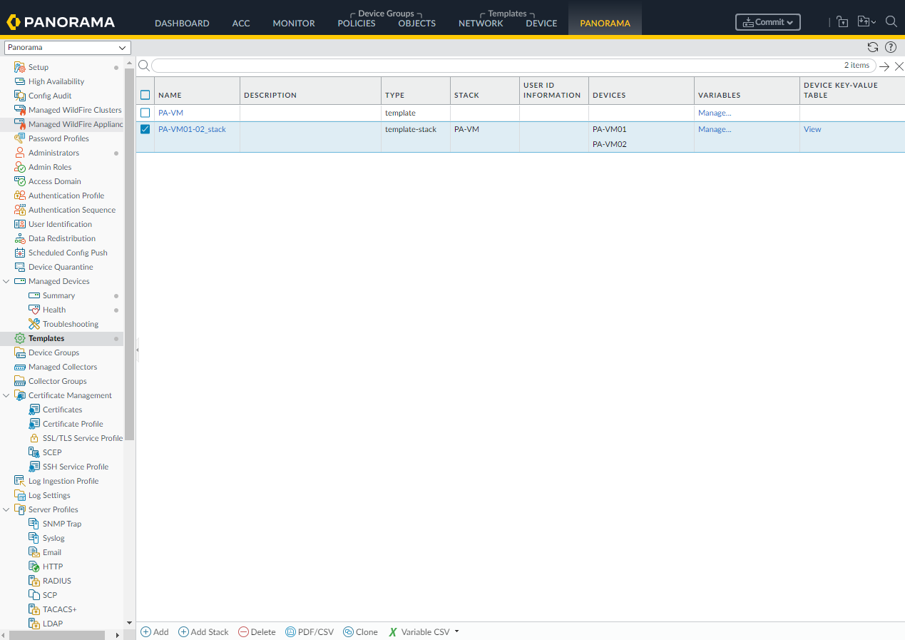 또한, Template 및 Template Stack을 만들어 공통적인 설정이 필요한 여러 방화벽에 Network와 Device에 대한 설정을 배포할 수 있다.Template Stack은 최대 8개의 Template을 결합하여 우선순위에 맞게 적용할 수 있다.